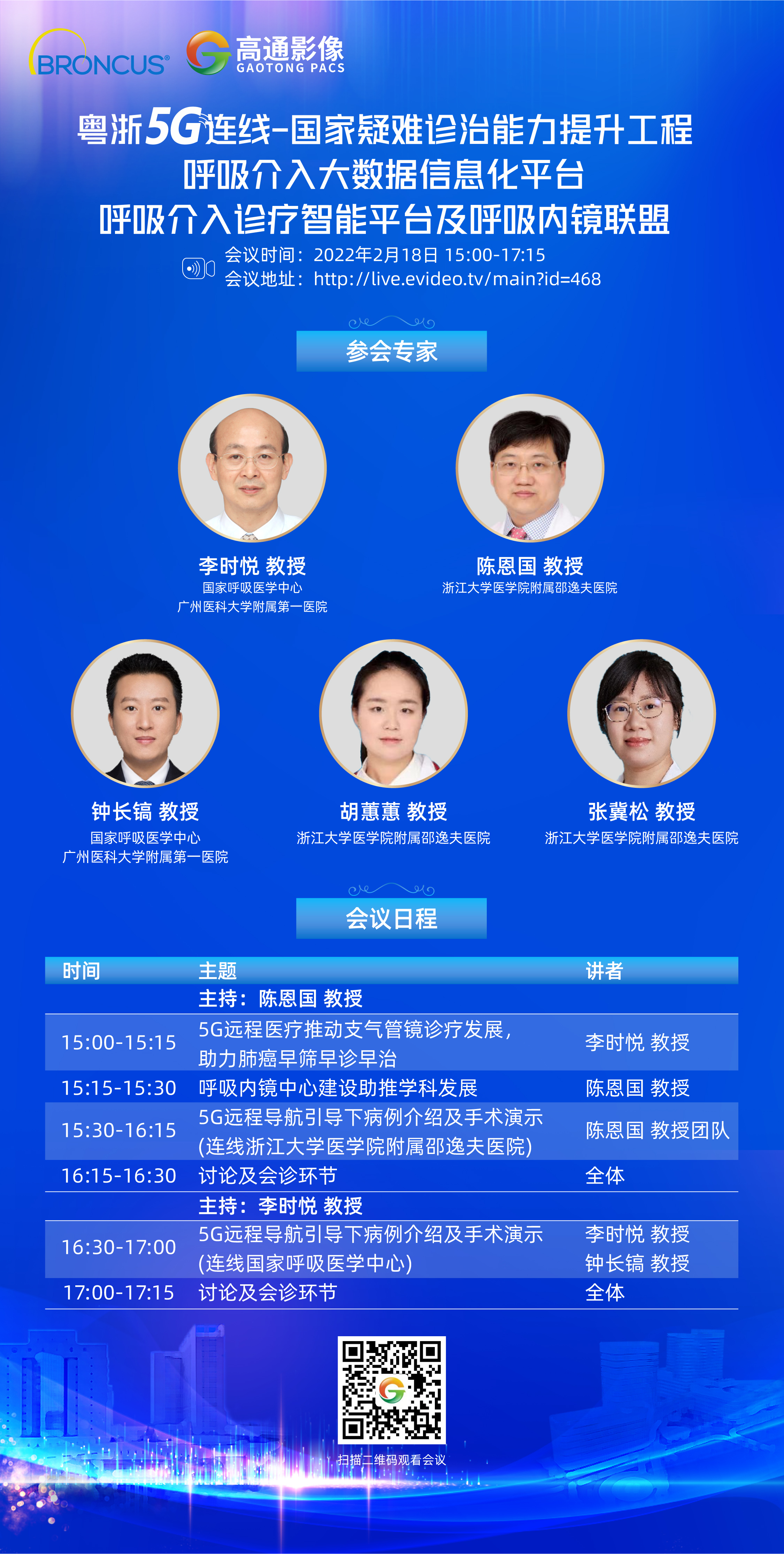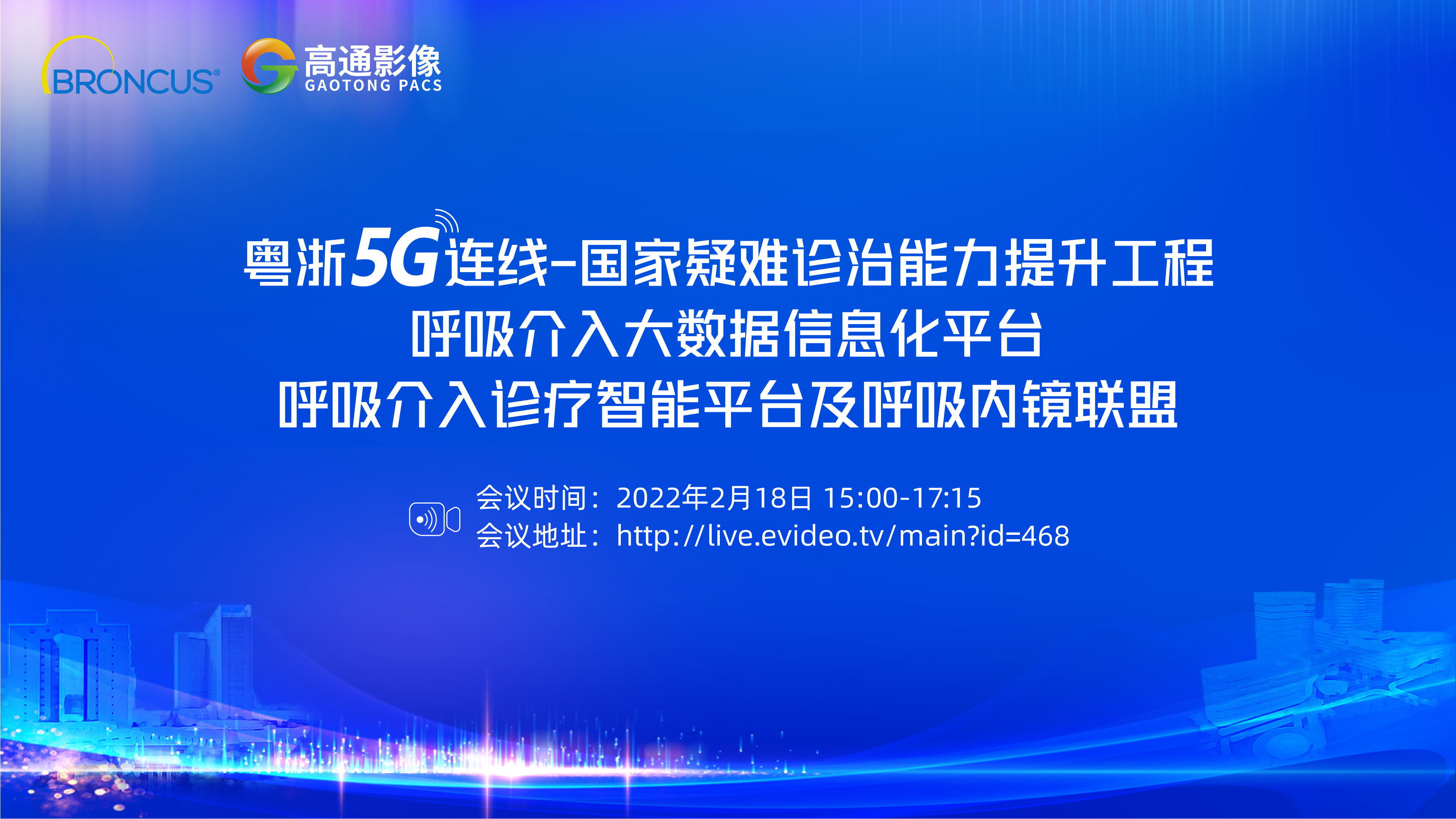 网络转播+直播|“粤浙5G连线-国家疑难诊治能力提升工程 呼吸介入大数据信息化平台 呼吸介入诊疗智能平台及呼吸内镜联盟 ”会议于2022年2月18日召开,会议地址:http://live.evideo.tv/main?id=468。感兴趣的各领域朋友可通过扫码下方二维码进入直播间,由广州高通提供服务,我们将进行全程直播,精彩不容错过哦,敬请期待!