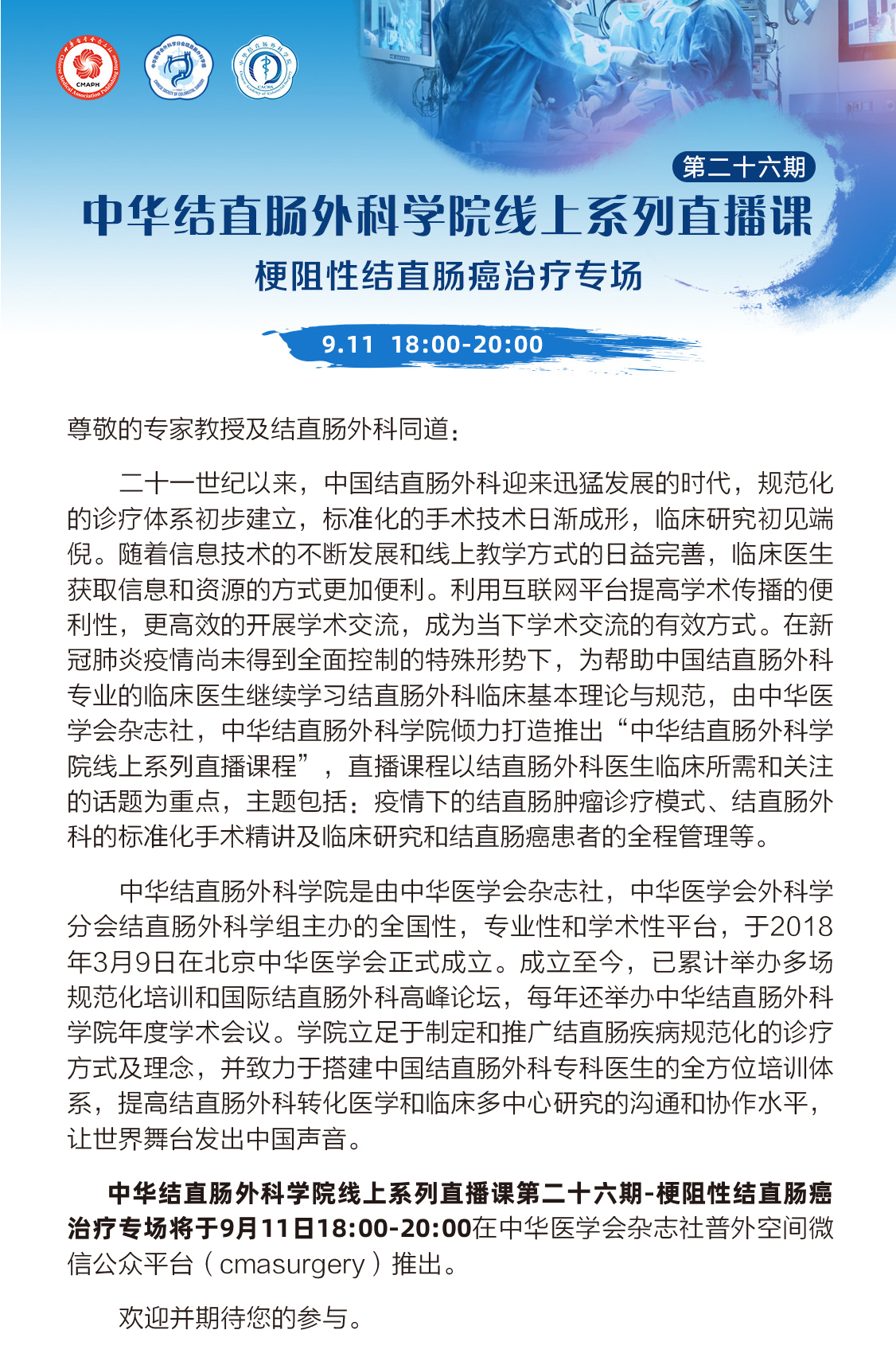 网络直播|第二十六期中华结直肠外科学院线上系列直播课-梗阻性结直肠癌治疗专场