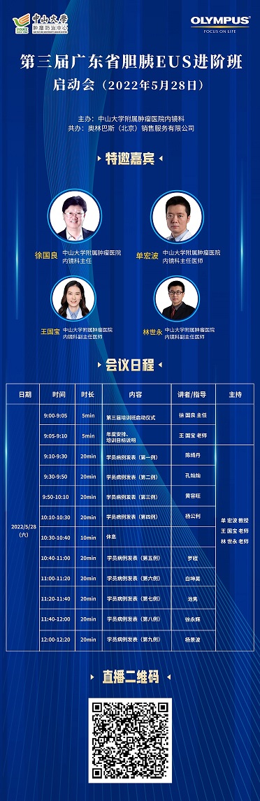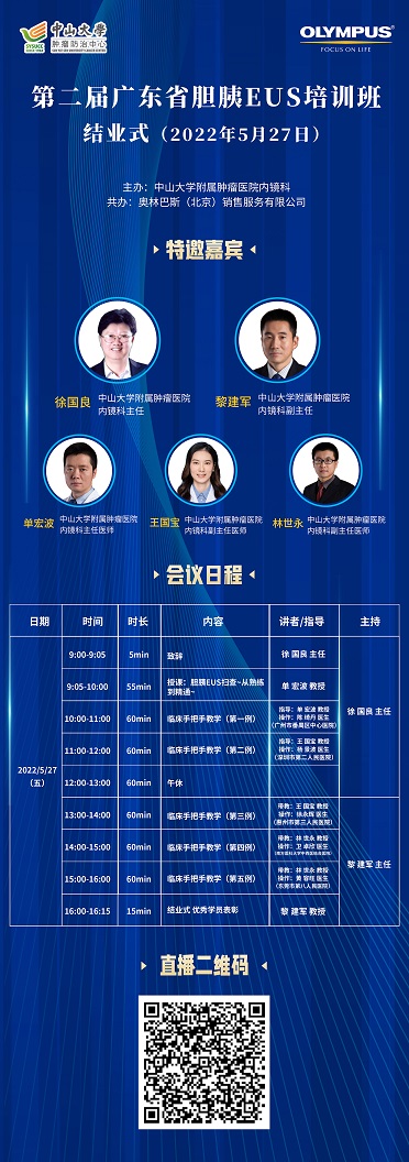 网络转播+直播|“第二届广东省胆胰EUS培训班 ”会议于2022年5月27至28日召开,本次会议由中山大学附属肿瘤医院内镜科主办;奥利巴斯(北京)销售服务有限公司共办;感兴趣的各领域朋友可通过扫码下方二维码进入直播间,由广州高通提供服务,我们将进行全程直播,精彩不容错过哦,敬请期待!